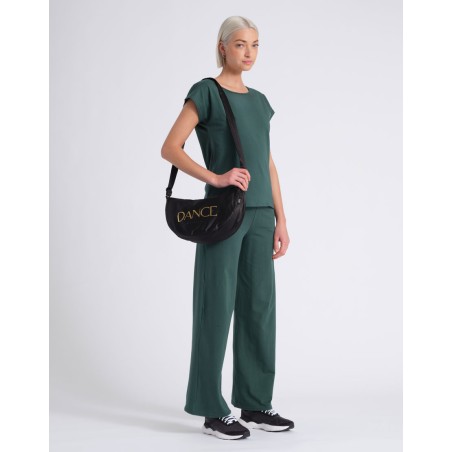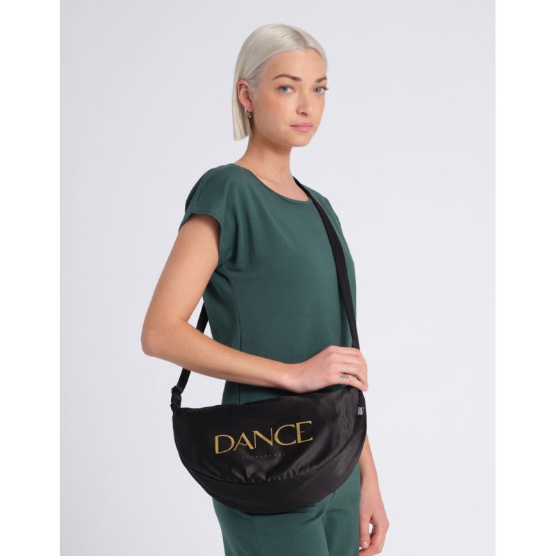 Alliez style et fonctionnalité avec ce sac demi-lune en satin de coton, pensé pour transporter vos essentiels avec élégance. Plus spacieux qu’un sac banane classique, il offre une bandoulière réglable et un logo DANCE élégant, doré ou noir selon le coloris, pour un usage fluide du studio à la ville.